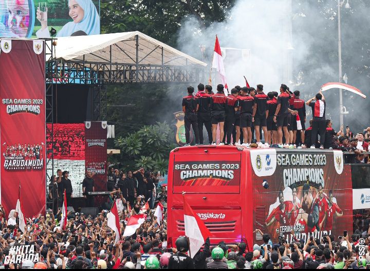 www.sportcorner.id - Parade juara timnas U-22 Indonesia telah dimulai. Marselino dan kawan-kawan keluar dari Hotel Fairmont sekitar pukul 08.00 WIB dan langsung disambut ribuan suporter timnas.