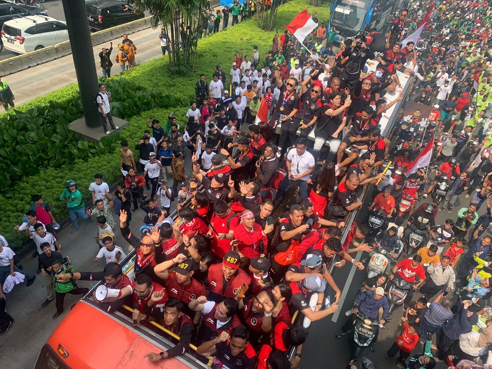 Para pemain timnas U-22 Indonesia sempat berhenti di Bundaran HI untuk menyapa ribuan suporter yang mengawal parade juara tersebut.