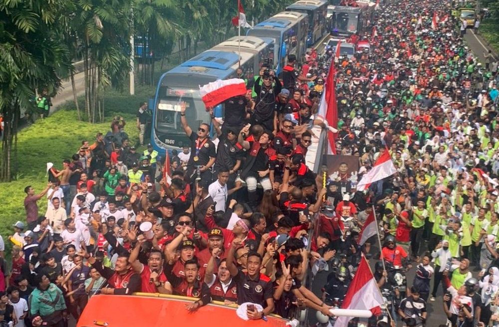 www.sportcorner.id - Arak-arakan timnas U-22 Indonesia dan atlet SEA Games 2023 turut diikuti oleh ribuan driver ojol atau ojek online.