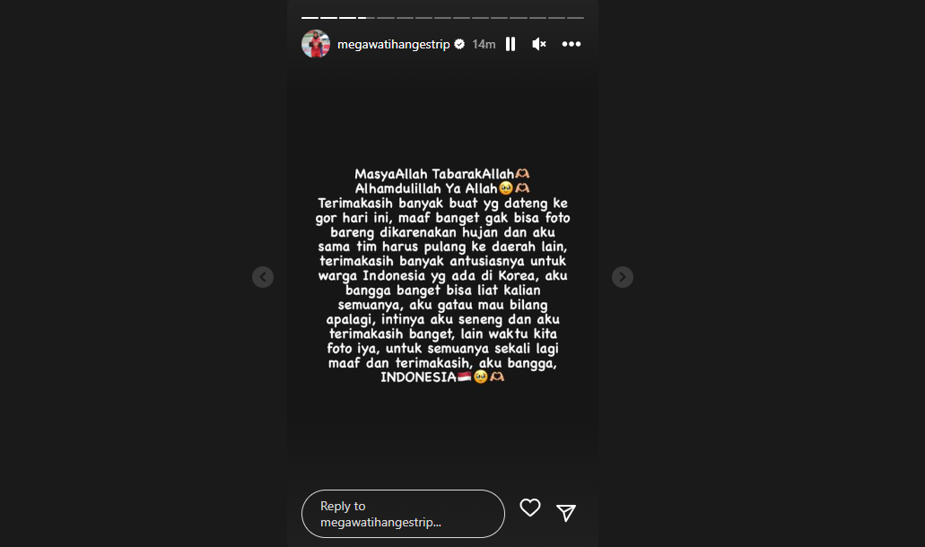 Itu terlihat melalui unggahan Instastory dalam akun @megawatihangestrip pada Minggu, 5 November 2023.